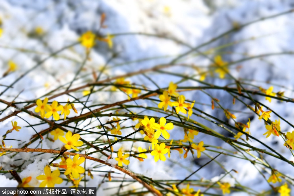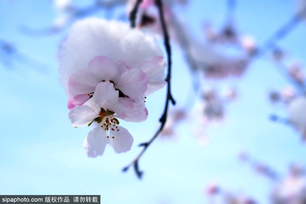 北京では最近続々とオウバイや桃の花などの開花の便りが届いていますが、17日はその花に冷たい雪が降りました。