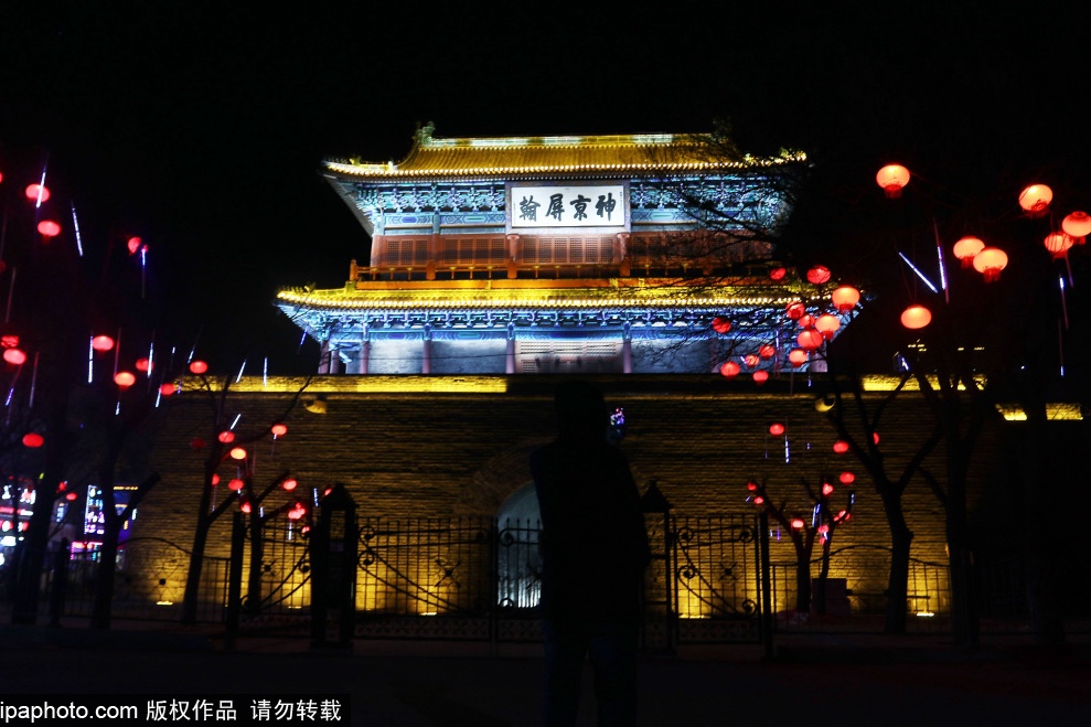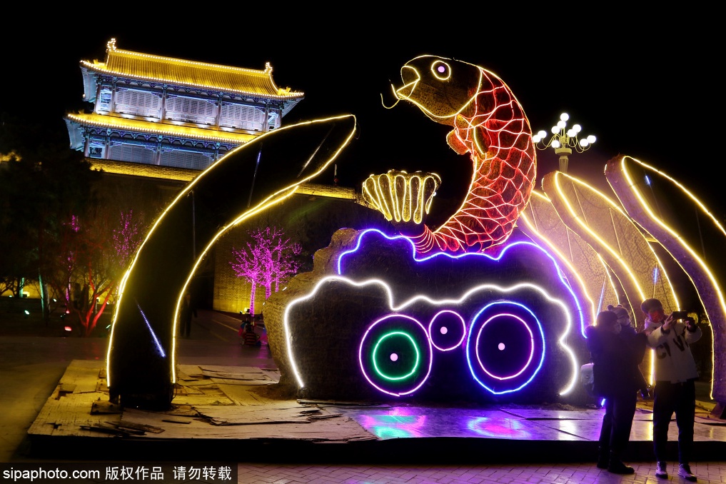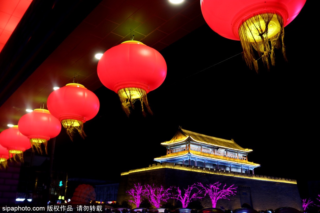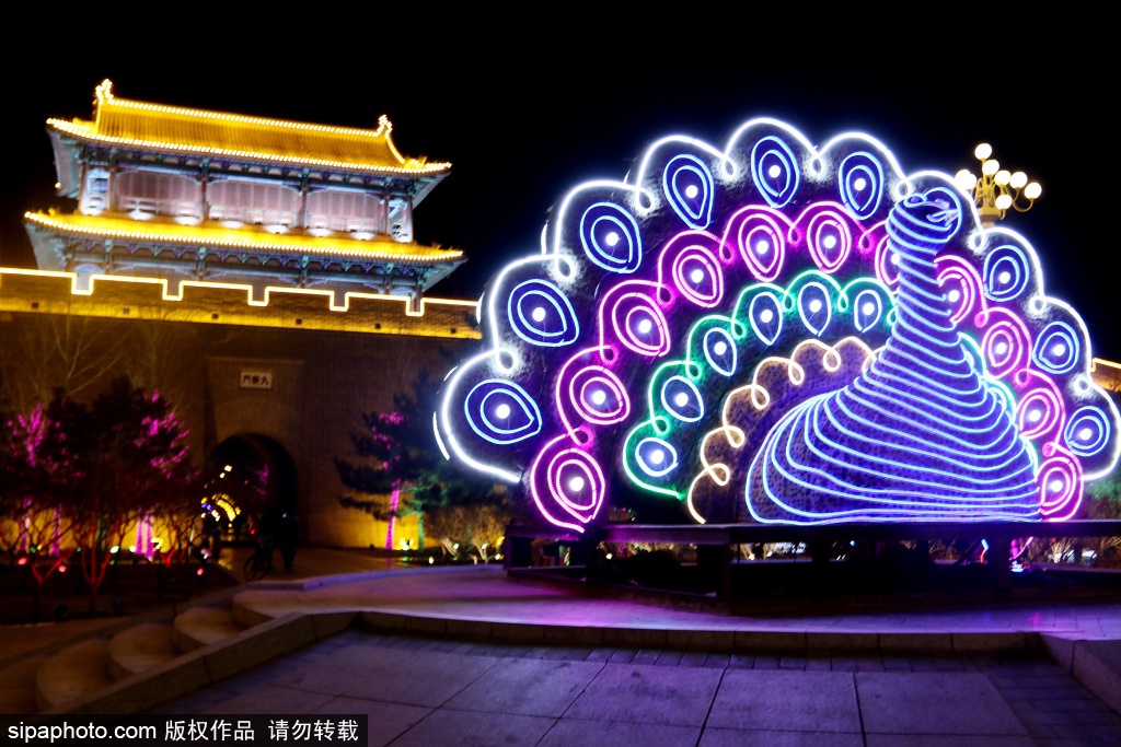 観光客が春節期間中、河北省張家口市の宣化古城で夜景色を楽しみました。古城は春節の灯篭やイルミネーションで輝き、絵に描いたように美しい夜景が広がっています。写真は宣化古城の夜景です。