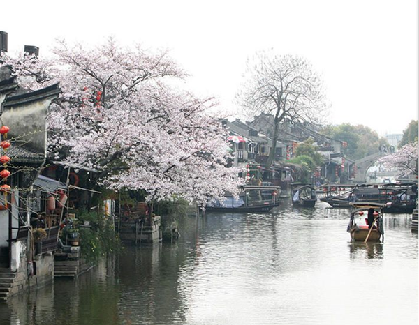 古い町並みの残る浙江省嘉興市の西塘鎮では毎年3月になると、桜が開花する。この街では、情緒あふれる古い街並みが桜の美しさをさらに引き出している。遊覧船に乗って、水郷からその桜を観賞すると、独特の情緒を楽しむことができる。