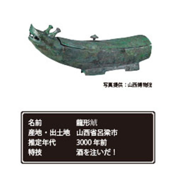 魚のようなフォルムに、2本の角…なんと龍を模したというこちらの青銅器。長さ43cm、背の蓋から酒を入れ、開いた口から注いだと考えられている。両側には、当時中国で信仰されていた1本足の龍神、夔(き)龍と、実在するワニの一種、ヨウスコウワニが模様となって描かれている。ヨウスコウワニのモチーフが青銅器に登場することは大変珍しい。