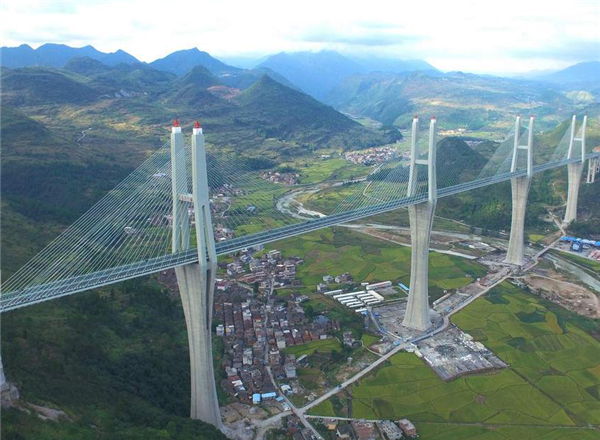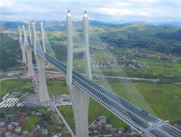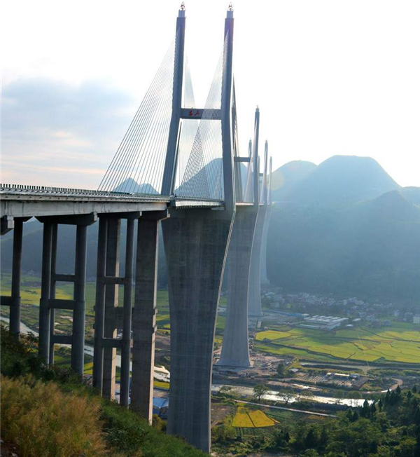 赤石大橋は同高速道路の湖南省区間が管理するプロジェクトで、橋梁は4つの主塔がデザインされたコンクリート製のダブルロープ斜張橋だ。1500メートルにわたる谷間をつなぎ、主塔の高さは一番高い塔で286メートル、平均高さは約270メートルとなっており、地面から端までの高さは一番高い場所で183メートル、最大スパンは380メートルとなっている。現時点で世界で一番長いスパンを誇る複数タワーブリッジのコンクリート斜張橋だ。(編集TG)