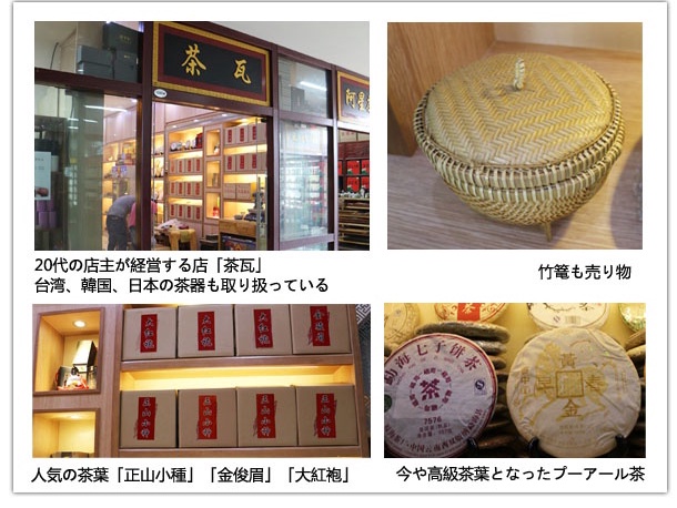 それに伴い、茶葉の価格の高騰化も進んだ。かつてプーアール茶は、安くて身体にいいことから香港や広州を中心に日常茶として人気があったが、2006年頃から始まった投機ブームで一気に値が高騰し、今では高級茶葉としてもてはやされている。また、2008年以降からは福建省の武夷山で生産される中国紅茶「正山小種」や、その中の最高級品種「金俊眉」、烏龍茶の代表的なお茶である武夷岩茶の「大紅袍」などが次々と流行。現在は、肌や身体にいいとされる白茶が注目されるなど、富裕層の拡大により、お茶にかけるお金や労力も増し、人々はより珍しいお茶や、より健康・美容にいいお茶を求め駆け回っている。