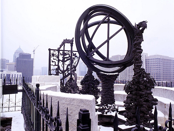 地下鉄環状線の建国門駅を降りて約一分のところに観象台があります。これは古代の天文台です。この古代天文台は、元の時代の天文台だった「司天台」の跡に、明の正統7年(1442年)に建てられたもので、明代には「観星台」と呼ばれていました。農業国である中国では、農耕に欠かせない暦を定め、公布することが、皇帝の権威の象徴であり、歴代皇帝は暦造りの基礎となる天体観測に大きな力を注いできました。