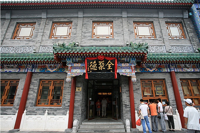 北京ダック専門店の中でも最も有名なのは「全聚徳」だろう。北京ダックが北京観光のイメージ大使となる地位を位置づけた。「全聚徳」の創業者である楊全仁氏はもともと家禽類を営む商人であった。彼は集めた資金で「全聚徳」を開き、清朝の宮廷厨房で北京ダック担当をしていた料理人を招き、宮廷の「吊るし焼き」技術を用い、吊るし焼きタイプの北京ダックを民間に広めた。北京ダックには、吊るし焼きタイプと蒸し焼きタイプのものがある。明朝永楽期に創業した、蒸し焼きタイプの北京ダックで有名な「便宜坊」は、実は全聚徳よりも歴史があり、600年近くの歴史を有している。