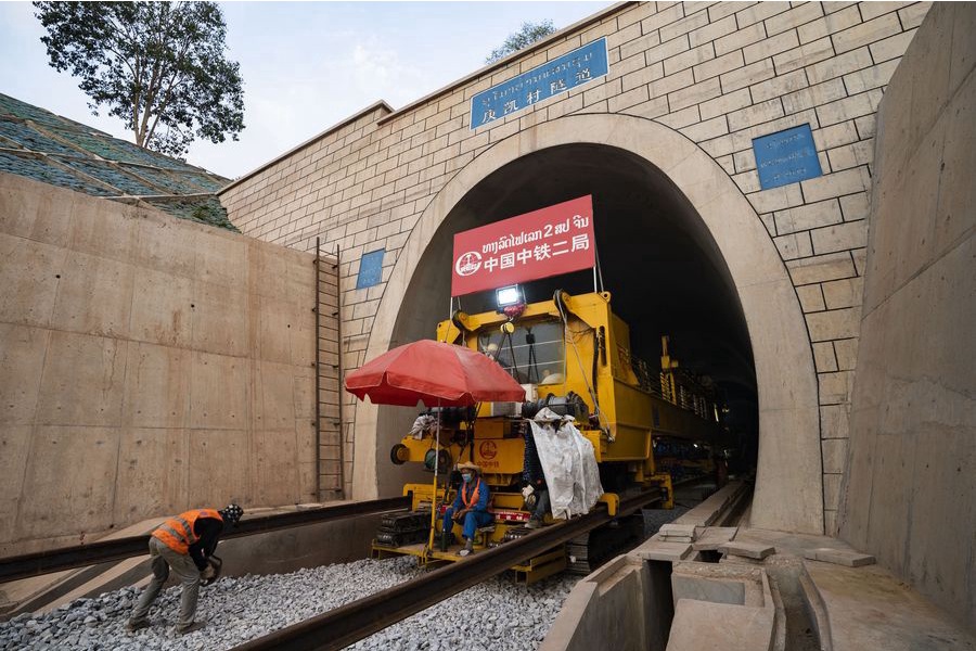 5月23日、ラオスの首都ビエンチャンから北へ約60キロ離れたビエンチャン県のノーンカーイ村トンネル施工現場で線路を敷設する労働者。(ビエンチャン=新華社配信)