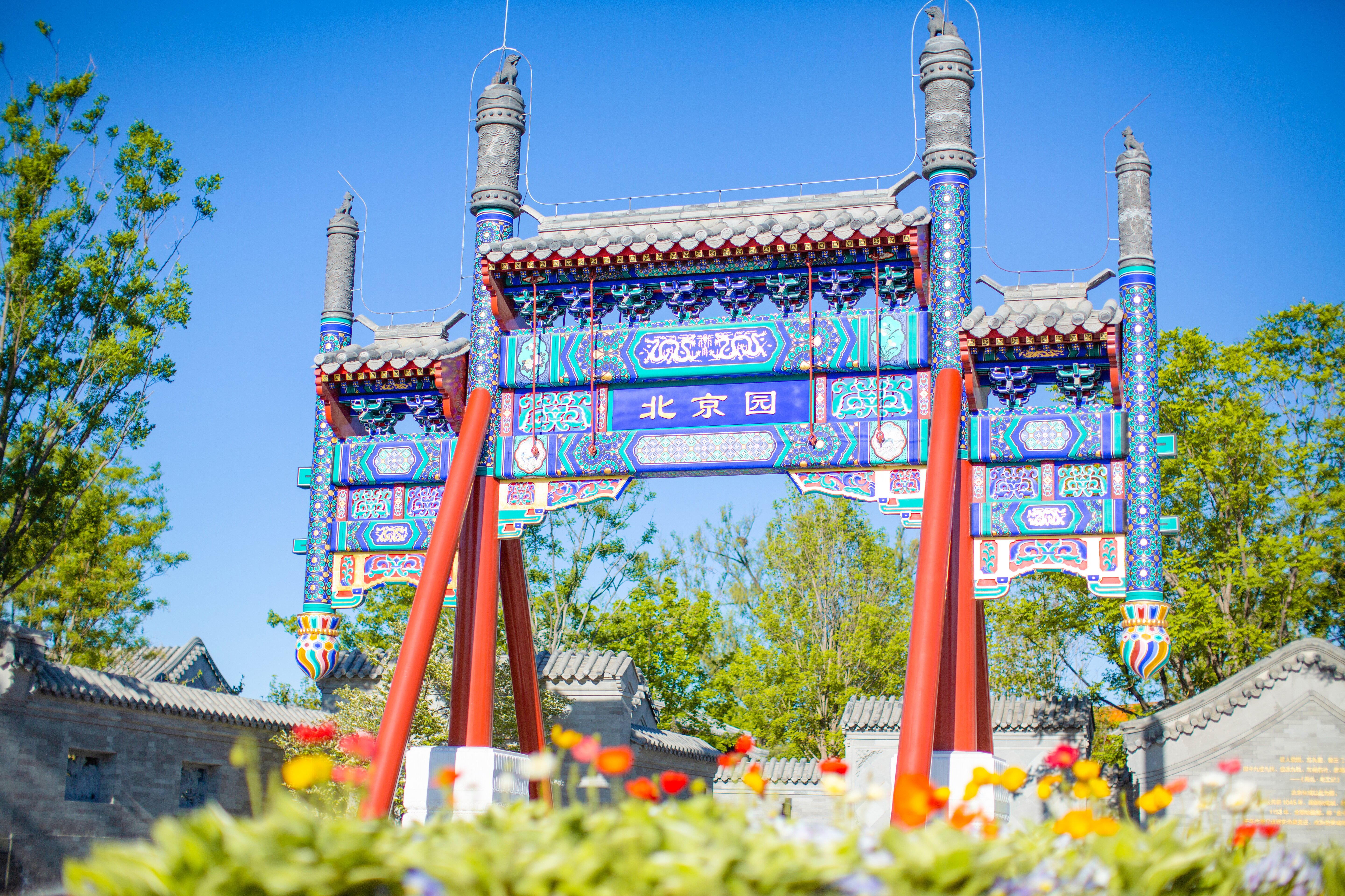 北京園は「私の家」をテーマとして、北京地元の特色ある植物を植えて、牌楼、胡同、四合院、紅壁と共同で「京味」ストリート景観を構築し、全面的に北京の古都風貌を展示する。古北京「四合院」を核心とする景観は各地からの観光客を歓迎するという意味を含み、各地の観光客は小院の中で北京の伝統の美しさを感じる。