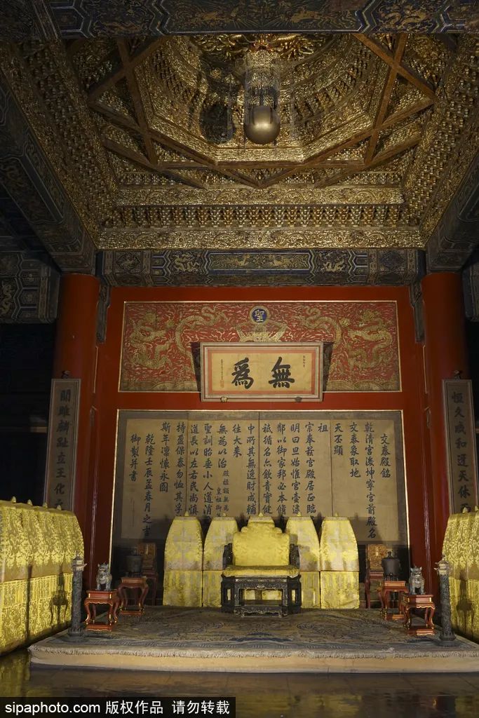 明間は宝座を設けて、上には康熙帝直筆の「無為」扁額を掛けている。上部は上部は盤竜銜え珠藻井で、地面には金のレンガが敷かれている。