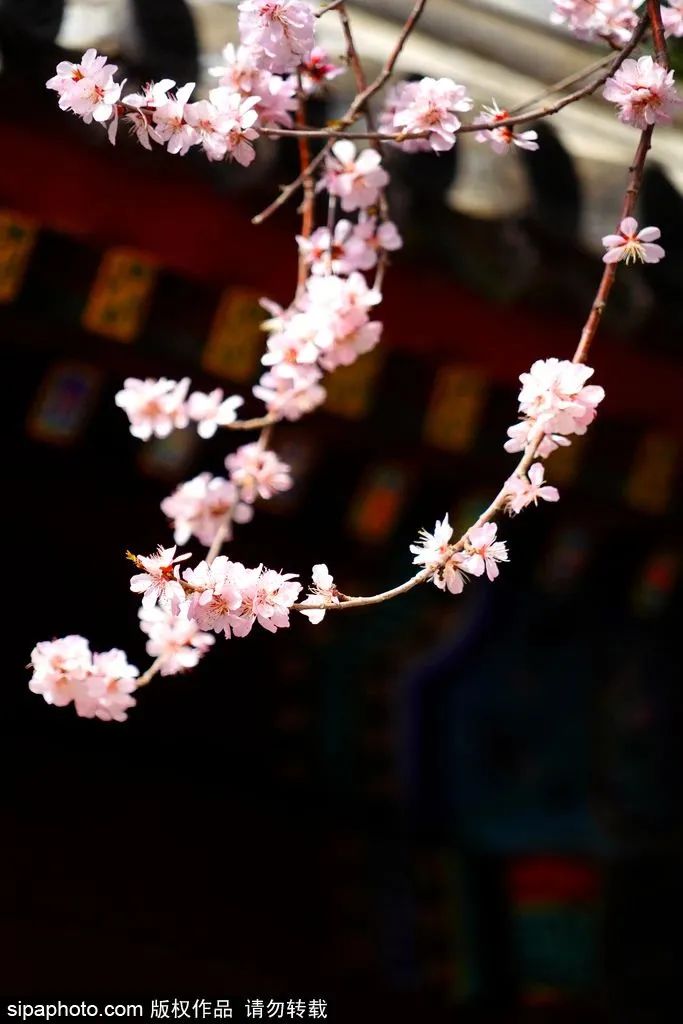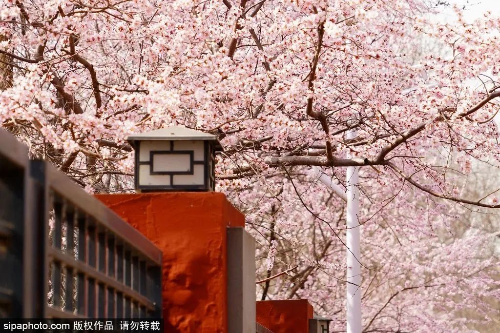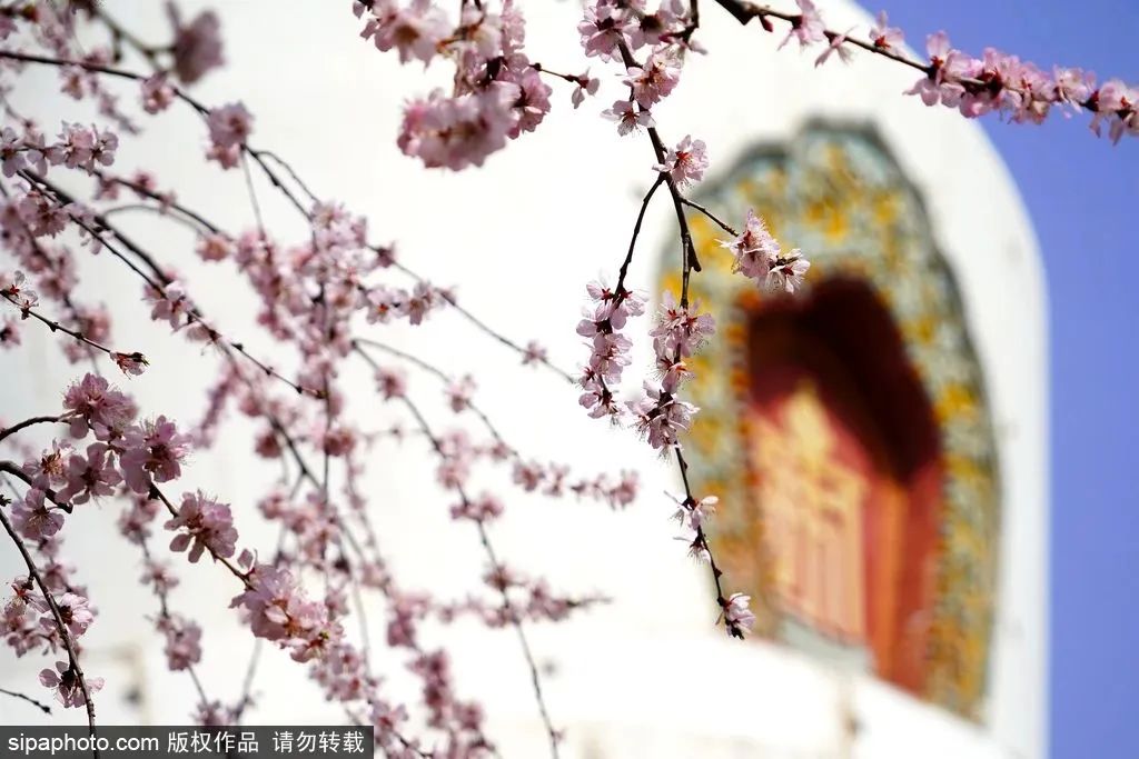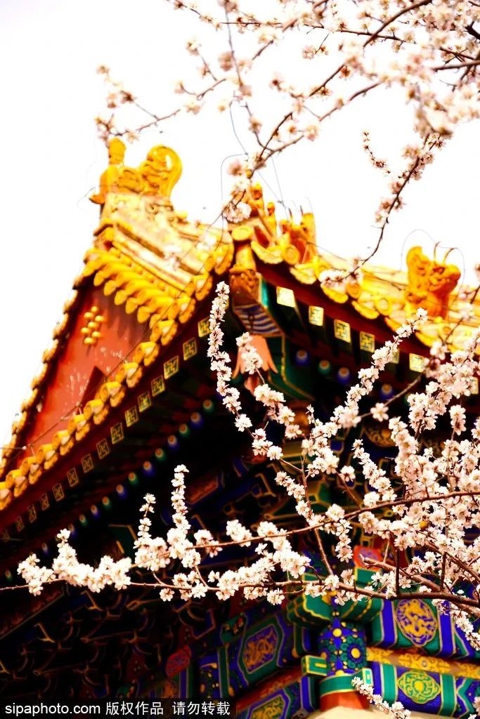 観光客が写真撮影を手軽に楽しめるように、公園では2つの撮影スポットをおすすめしています。1つは塔の西側の手すりの下、もう1つは白塔へと続く階段から振り返る場所です。皇家御苑の朱色の壁、金色の屋根の装飾、そして粉白色の優美な桃の花が相まって、非常に美しい風景が撮影できます。