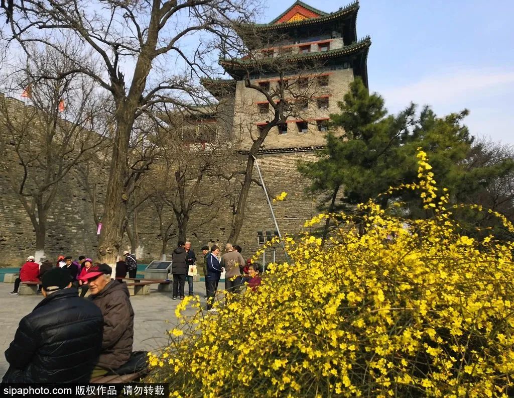 春風に吹かれ、明城墙遺跡公園の春の花である迎春花、梅、桃が次々と咲き、それぞれの美しさを見せています。多くの観光客が花を鑑賞したり、撮影したりして、「北京の春の色」を散策しています。