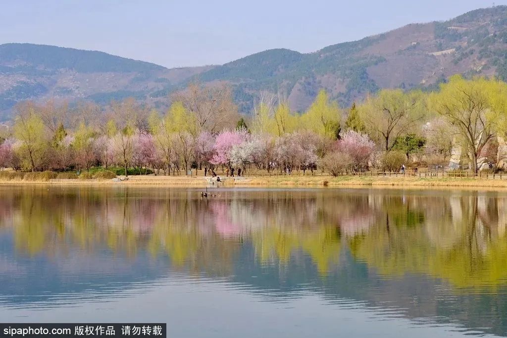 最近、気温が上がるにつれて、国家植物園の春の花が次々と咲き始めました。湖の周りには山桃や梅の花が咲き、遠くの山々や緑の柳と一緒に湖面に映り、春の絵画のような景色を作り出しています。