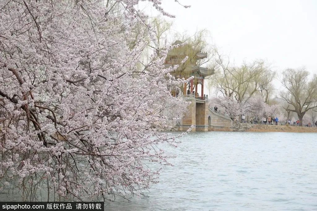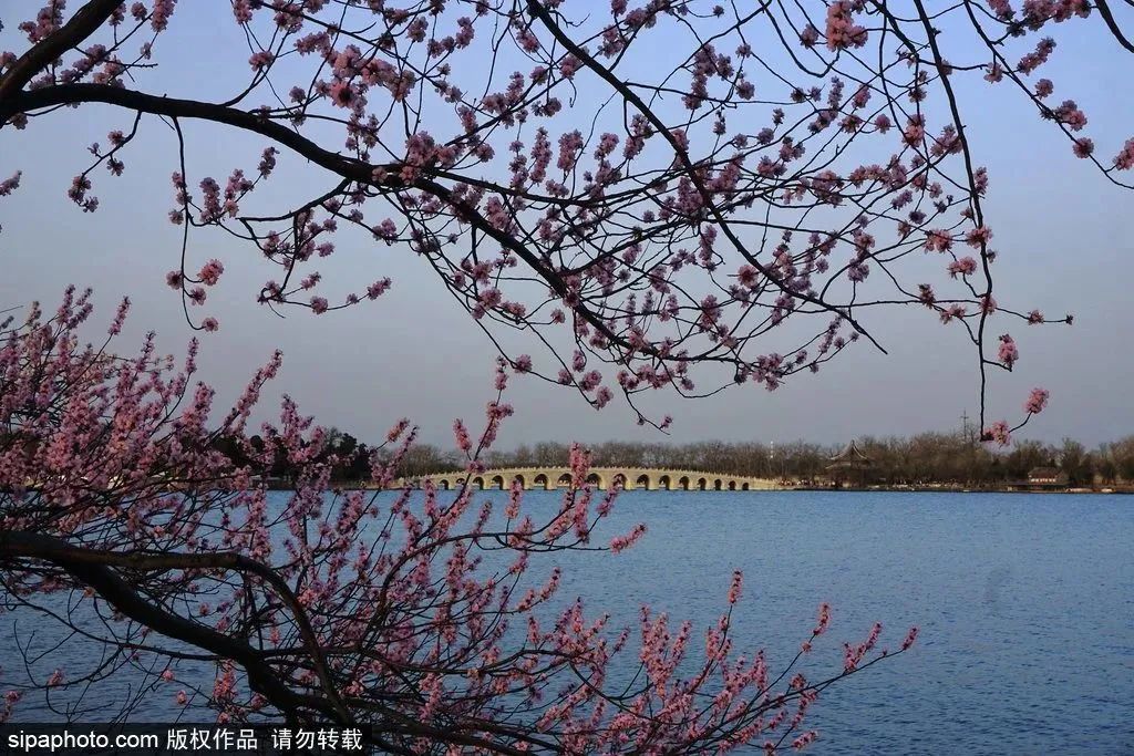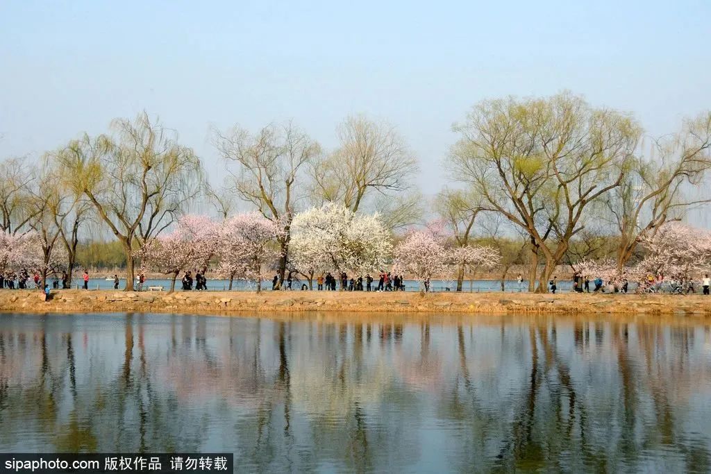 山桃が碧い波に映え、西堤の春の景色の独特な魅力は、山桃の枝がすべて昆明湖に向かって伸びて水を求める美しい様子です。いくつかの枝はすでに水中に入り、一つ一つの桃の花が水面に浮かんでいます。山桃の花期は約1週間で、山桃が終わった後は碧桃や柳などの景色があり、観賞期間は3月中旬から4月中旬まで続きます。