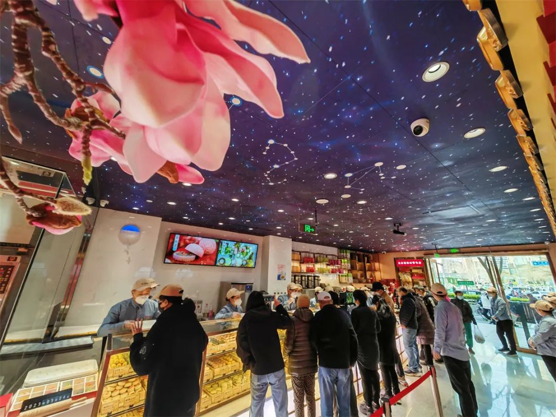 店内に入ると、天井には深い青色の星空のグラフィックが輝き、木製のレトロな窓枠から、アニメーションで春の節気が生き生きと描かれ、多くの観光客を引き寄せています。