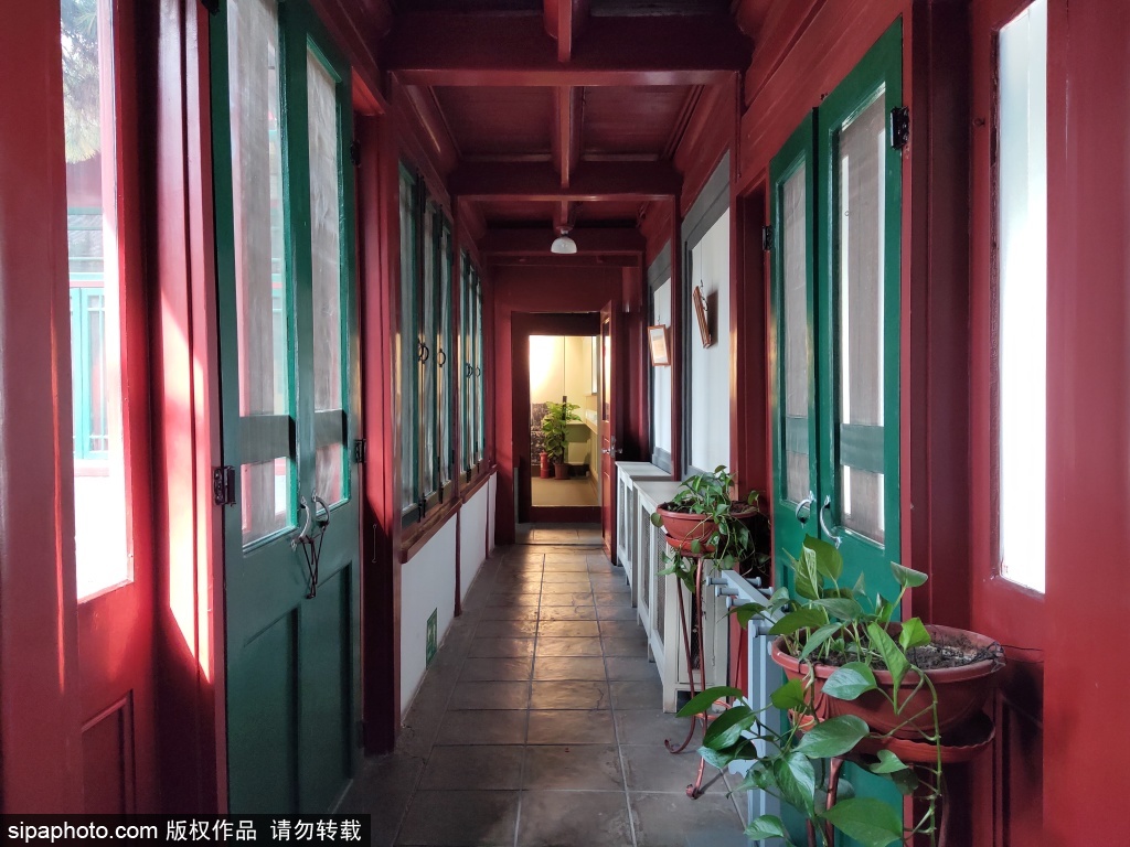 垂花門をくぐり、二重の庭園に入ると、ここには正面に5つの部屋があり、東西の広間があり、回廊で繋がっています。庭園には2本のほぼ100年のツバキの木があり、風に揺れて優美な姿を見せています。正面の部屋は、郭沫若が生活し、読書や客人を迎える場所であり、すべての家具や装飾は、彼が生前に使用していたものと同様に配置されています。
