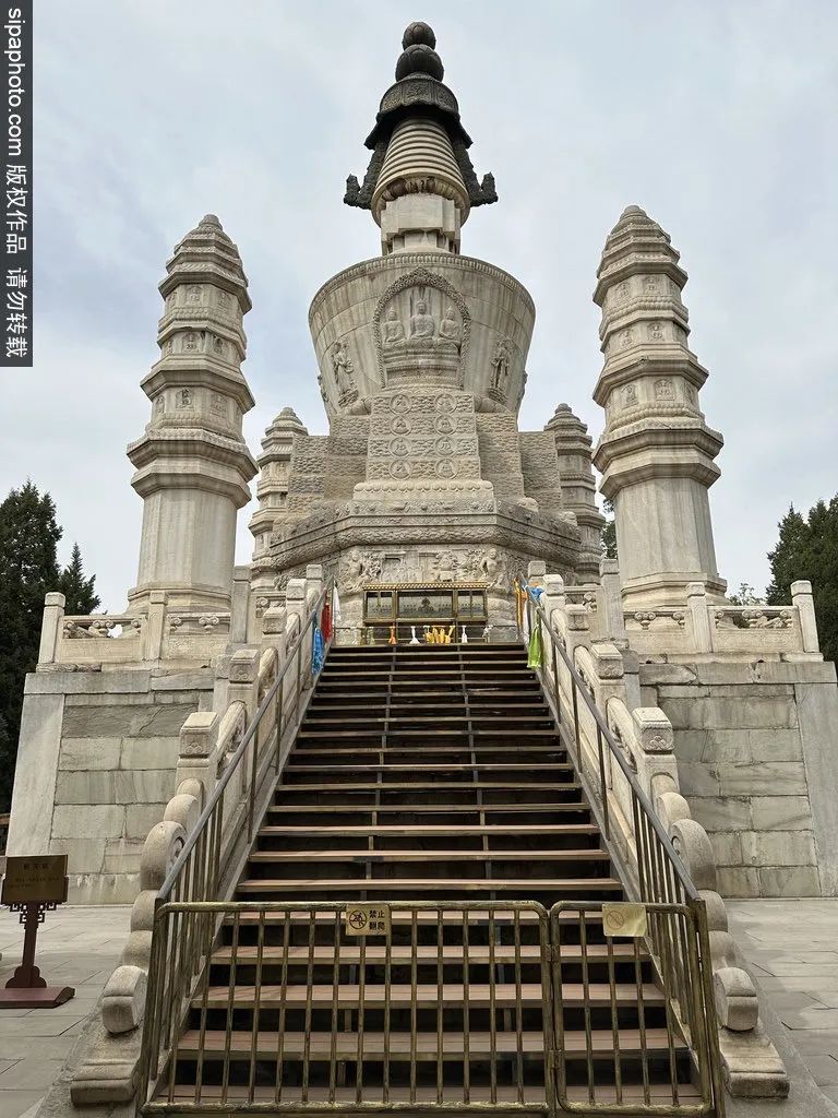 形状はインドのブッダガヤーの金剛座を模しており、「亜」の字形をしています。3メートル以上の高さの漢白玉の金剛座の上には、5つの塔が建てられています。主塔は西藏の覆鉢式塔で、高さは23.28メートルで中央に位置しています。周囲には各々9メートルの八角形の行経幢式塔があり、外に突き出ています。