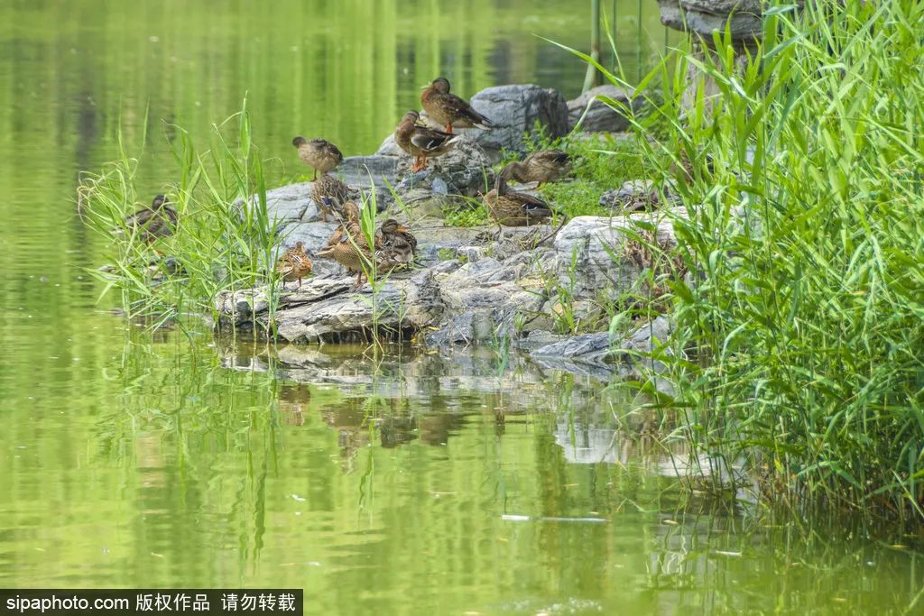 公園内の青石畳の道を歩いていると、池の大きなハスの葉が、みずみずしいハスの花を引き立てていた。カモが時々湖にぴょんぴょんとばして、野趣たっぷりに楽しませてくれる。