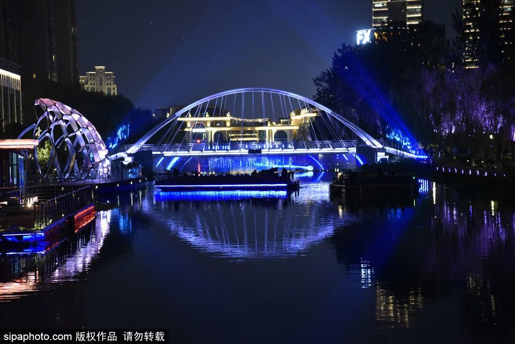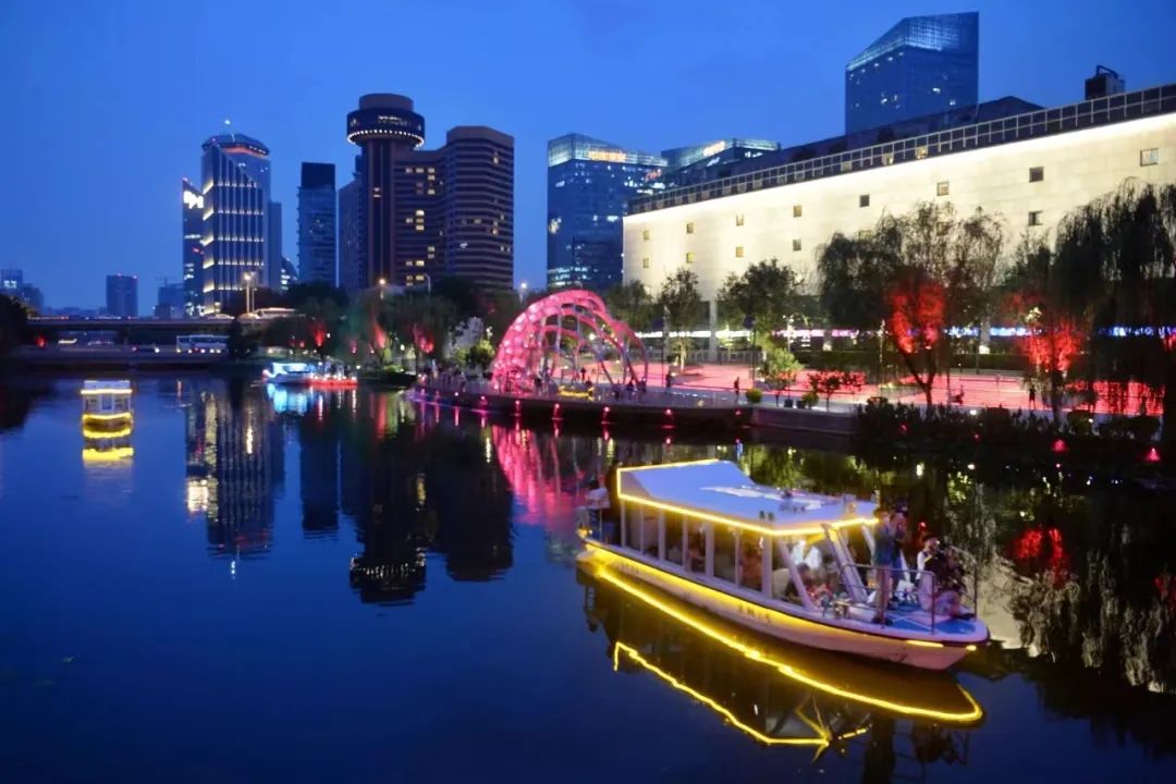 水遊び好きの市民は航路に沿って船に乗って亮馬河を遊覧し、二十四橋十八景を鑑賞するほか、通恵河畔で千年運河の風景を楽しむことができる。湖心島の七色菩提古木、テンロン閣、岸辺のアンティーク建築がきらめく水面に映り、夜の帳の下の「中国風」は格別だ。