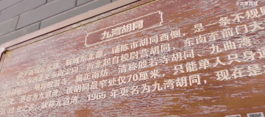 九湾胡同は、その名の通り、曲がり角が多いことで知られている。東から西までわずか390メートルの長さに、まっすぐなカーブ、急カーブ、斜めカーブ、緩やかなカーブが並んでいて、本当にカーブが続いてカーブが重なっている。路地の東口から入ると、やや広く、一般的な路地と変わらない。西へ行くにつれて路地はますます狭くなり、路地の西端の一番狭い所を一人しか通れなかった。