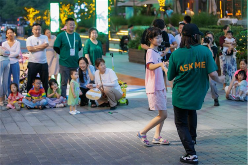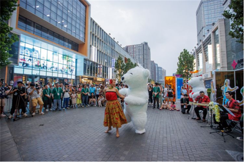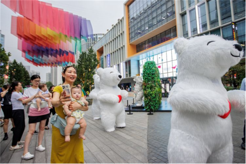 8月8日の夜に行われた望京小街開業3周年の祝賀イベントで、練り歩くベルリンのマスコットである熊のそばで記念写真を撮る市民