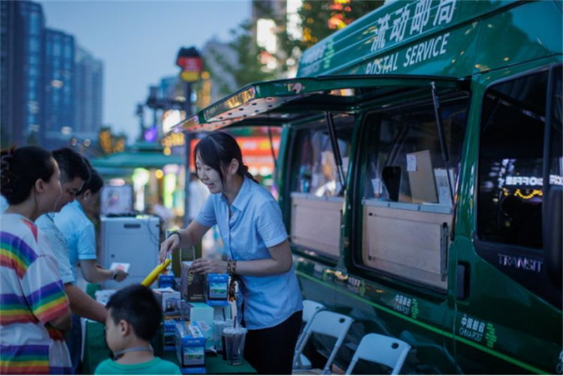 移動式郵便局の前で文化クリエイティブグッズを購入する市民