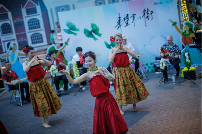 イベント会場では、リズム感あふれるハワイのフラダンスとジャズ演奏が交互に上演され、市民を魅了した。望京小街は2020年8月8日に正式にリニューアルオープンした。かつて車や電動二輪車、シェアバイクがひしめき合い、人とモノであふれかえっていたこの細長い通りは、今や国際的な雰囲気と文化・風情あふれるおしゃれな街へと生まれ変わった。