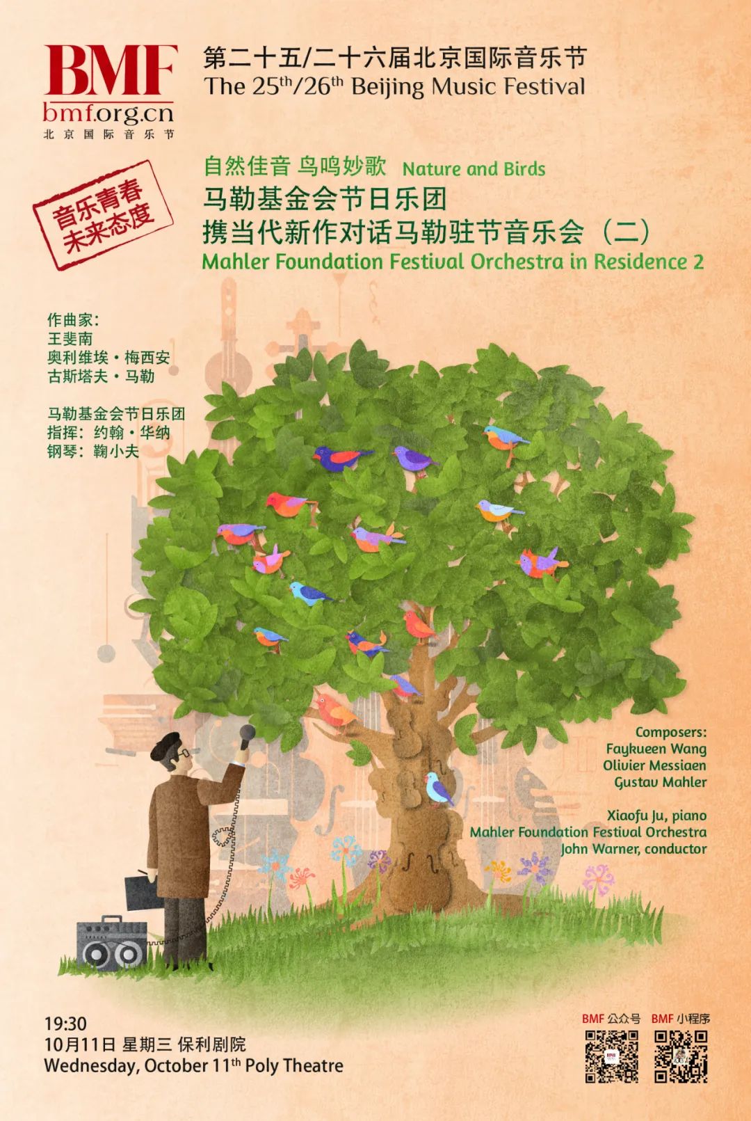 このコンサートのテーマである「鳥のさえずり」は、マーラーの交響曲第1番に登場する自然を描いた音楽の言葉に由来する。青年作曲家の王斐南氏の創作作品「量子海洋館」とメシアンの古典作品「異国の鳥」は、自然関連の話題の中で、グスタフマラー氏と一風変わった音楽対話を繰り広げる。自然に打ち勝つか、調和するか。それぞれの時代の作曲家が出した答えが、これらの作品の中に隠されている。