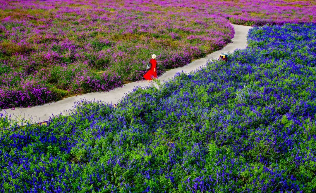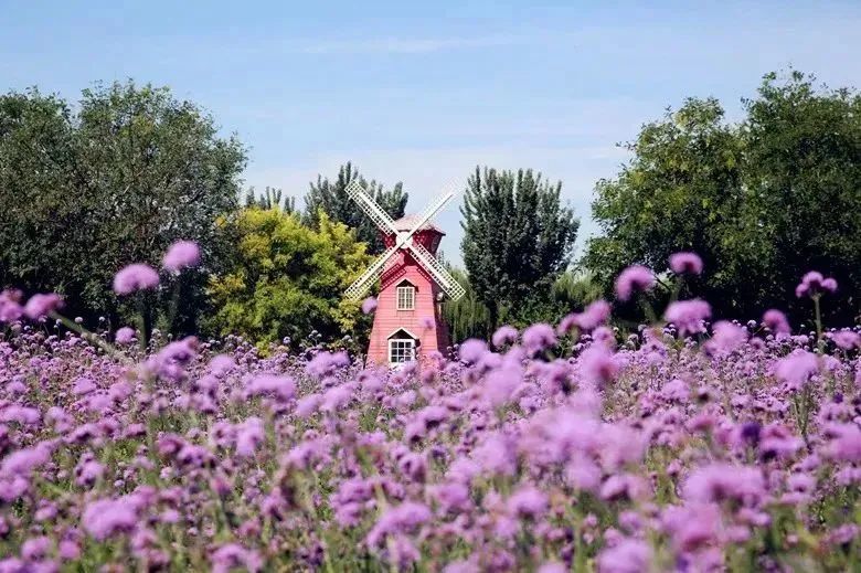 広大な紫色の花畑とヨーロッパ風の建物が一体となり、夢幻的で美しい雰囲気を演出しています。園内には高級なキャンプ用テントや大きな天幕エリアが設置されており、数千人のイベントに対応できる大草地やステージもあります。