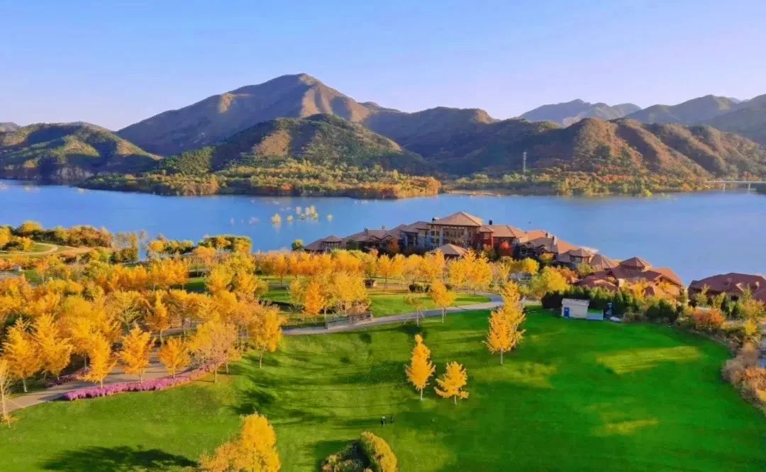北京平谷区東南盤山ふもとの海子村には、金海湖があり、北京城から85キロ離れており、北京市の三大ダムの一つである。高山の平湖、青い波が揺れ、青空と白い雲、青い芝生、山水の間を泳いで、至る所に美しい景色がある。