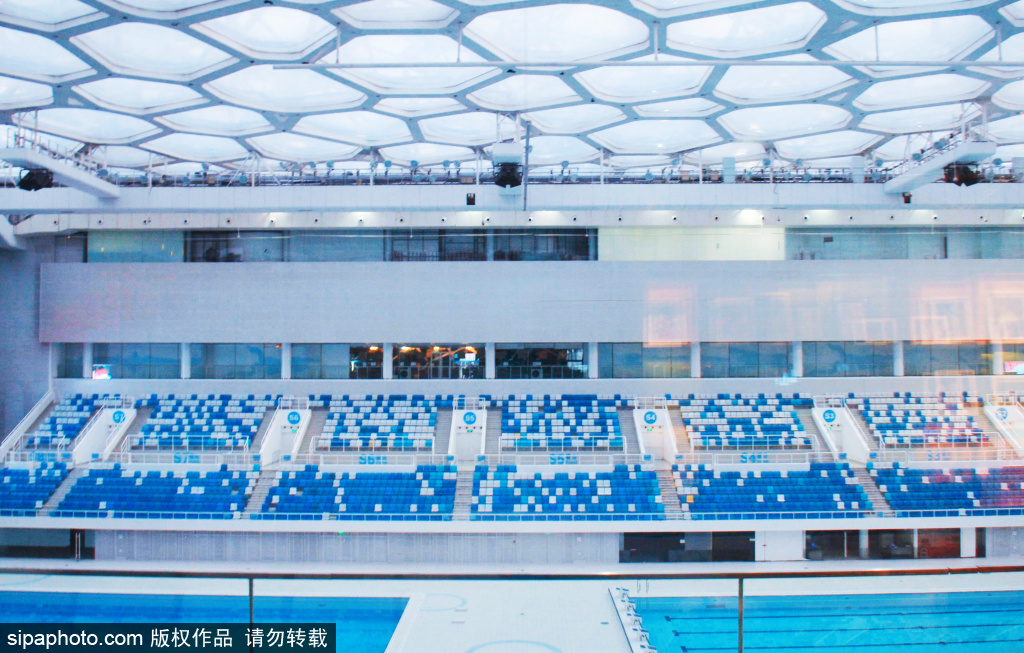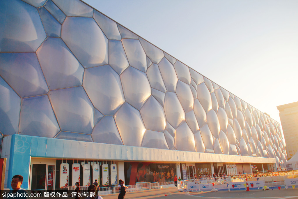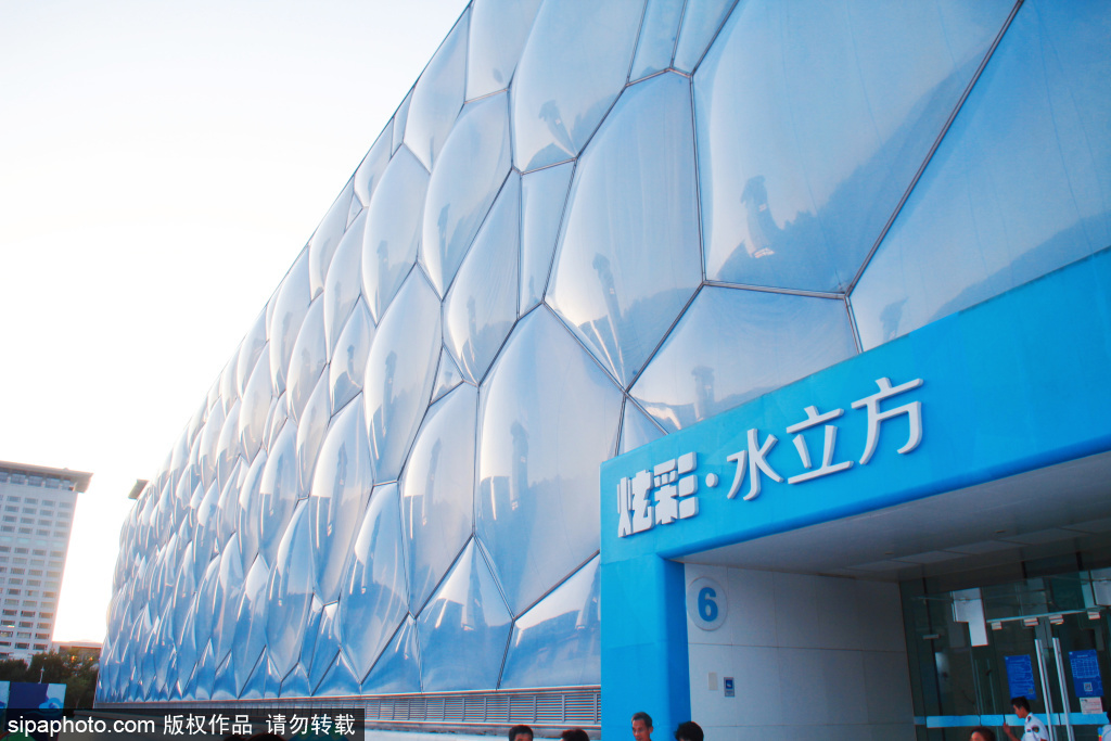 夢のような広場の「水の泡」効果は、人々に深い印象を残します。北京の中心軸の北端の両側に、青い色の水の分子ビルと国家体育場(通称「鳥の巣」)があり、片側が円になって、中国の建築概念である「天園地方」を反映した建物です。鳥の巣のデザインに比べ、ウォーターキューブは柔らかで美しく、視覚的に鮮烈なコントラストを形成し、共に北京の歴史文化都市の完全なイメージを形成しているのです。