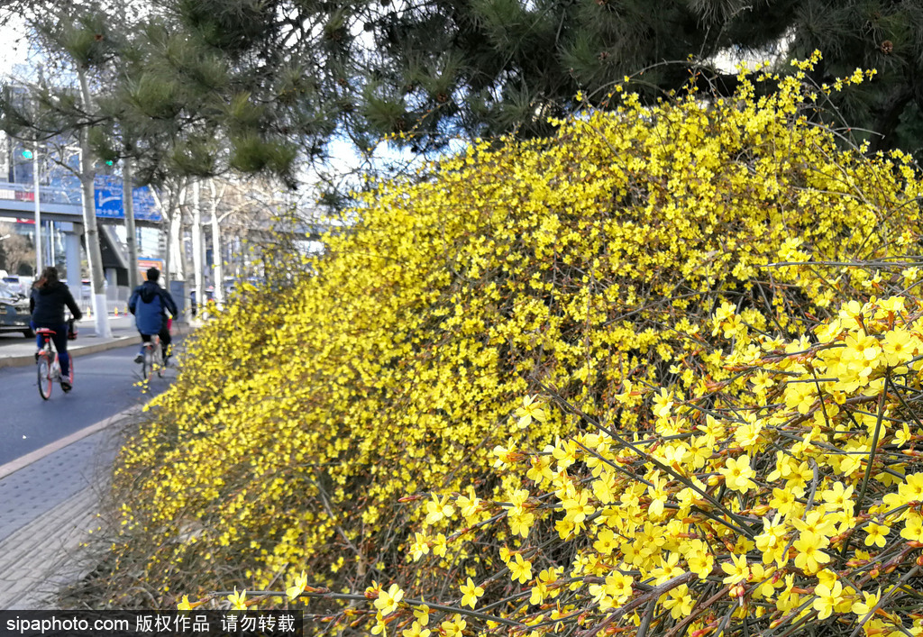 公園で春を楽しむ時間がない場合は、東二環道路沿いを散策したり、自転車に乗ったりするのも素晴らしいだ。わざわざ探す必要はなく、道で春とぶつかることができる。オウバイは北京二環路に帯状に分布しており、朝陽門橋から東便門橋までの景観が最も盛んでおり、数キロに及ぶ。若い黄色のきれいな迎春の花は松や柏に映えてさらに美しく、その枝は行き交う人々に「身をかがめて」あいさつするようだ。