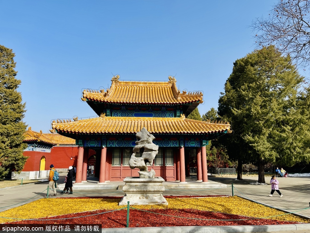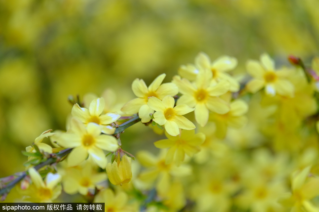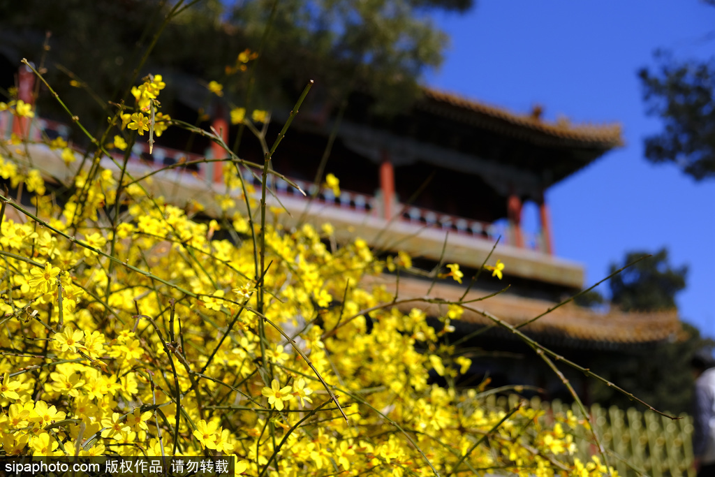 景山の迎春花は全園に分布しており、株型が散らばっており、柔らかい枝が垂れ下がっており、黄金色でかわいい。綺望楼は景山の前の山のふもとにあり、明代にはここに山前殿と呼ばれる五開間の本堂が建てられ、皇帝が客を招待する宴会場だった。綺望楼の前にある迎春の花が古い建物に春の息吹を加えた。景山上山道の迎春花は観光客の足取りとともに山を上り、春の足取りを加えている。万春亭に登って街全体を見下ろすと、古い紫禁城と現代の北京の新しい姿が一望できる。迎春の花の遊び心を味わい、宮廷の古建の壮大さを読んでこそ、このような花見の旅は更に充実している。