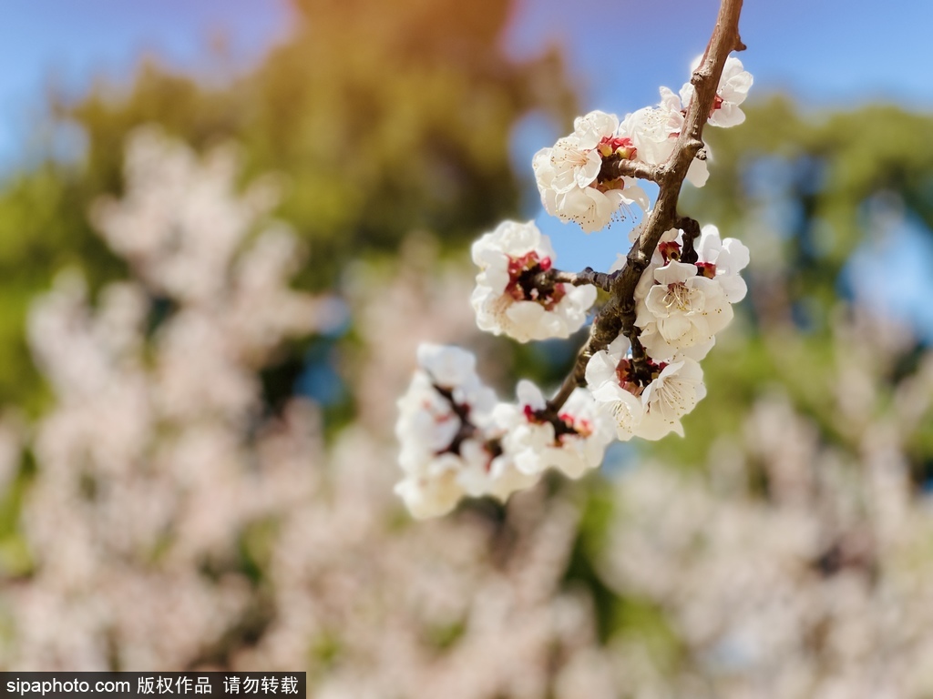 桃の花がまだ咲いていない時、杏の花はすでに山の斜面に咲いて、簡単な花びら、素朴な色はまるで隣の少女のようだ。中国の伝統では、杏の花は十二花神の二月の花であり、地位の高さを十分に示している。杏の花には色が変わる特徴があり、つぼみが出ている時は鮮やかに赤くなり、花びらが伸びるにつれて色彩が濃いから薄くなり、謝落する時は真っ白になる。北京で杏の花を鑑賞するには、城外でもいい選択肢がある。天壇から長城まで、杏の花は古い建物を引き立てて、白くて素朴だ。