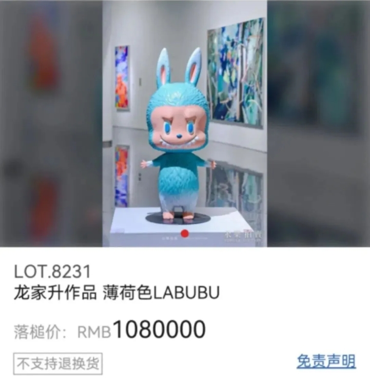6月10日、世界に一体しかない、ミントグリーンのラブブが、オークションハウス「永楽国際拍売」のオークションに出品され、108万元(1元は約20.1円)で落札された。その高さは131センチで、材質はPVC、「世界に一体しか存在しない作品」と説明されている。
