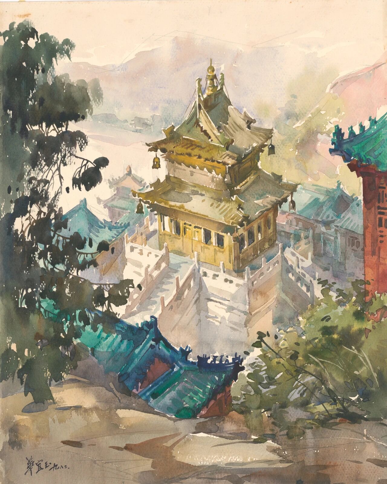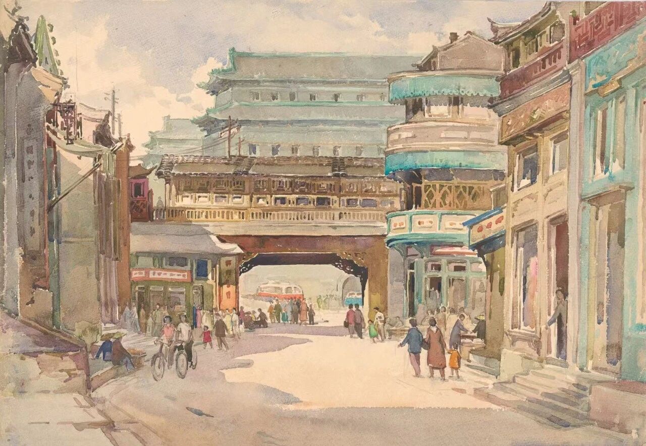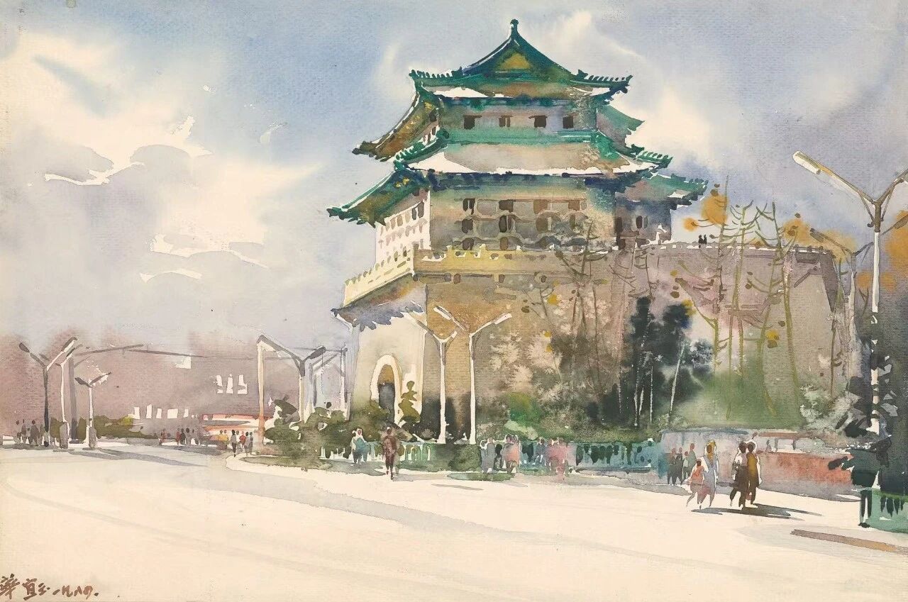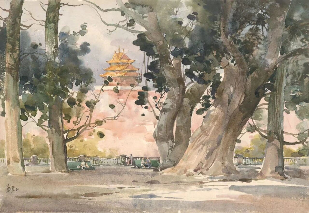 北平国立芸専油画科を卒業する頃には、西洋絵画の色彩論理と中国伝統書画の筆墨功力を兼ね備えていました。1952年、30歳で清華大学建築学科に赴任し、そこから半世紀にわたり教鞭を執りました。授業では「観察は深く、表現は簡潔に」と強調する厳格な教師でありながら、授業後には画板を背負って北京の街を写生して歩き、青春から老境に至るまで筆をもって北京の時の移ろいを記録しました。2005年に逝去する直前まで『建築水彩画技法』の原稿を修正し続けたその執念は、すでに一枚一枚の作品に刻まれています。