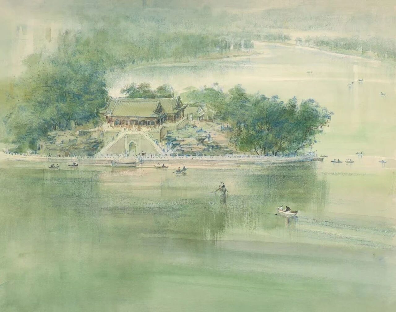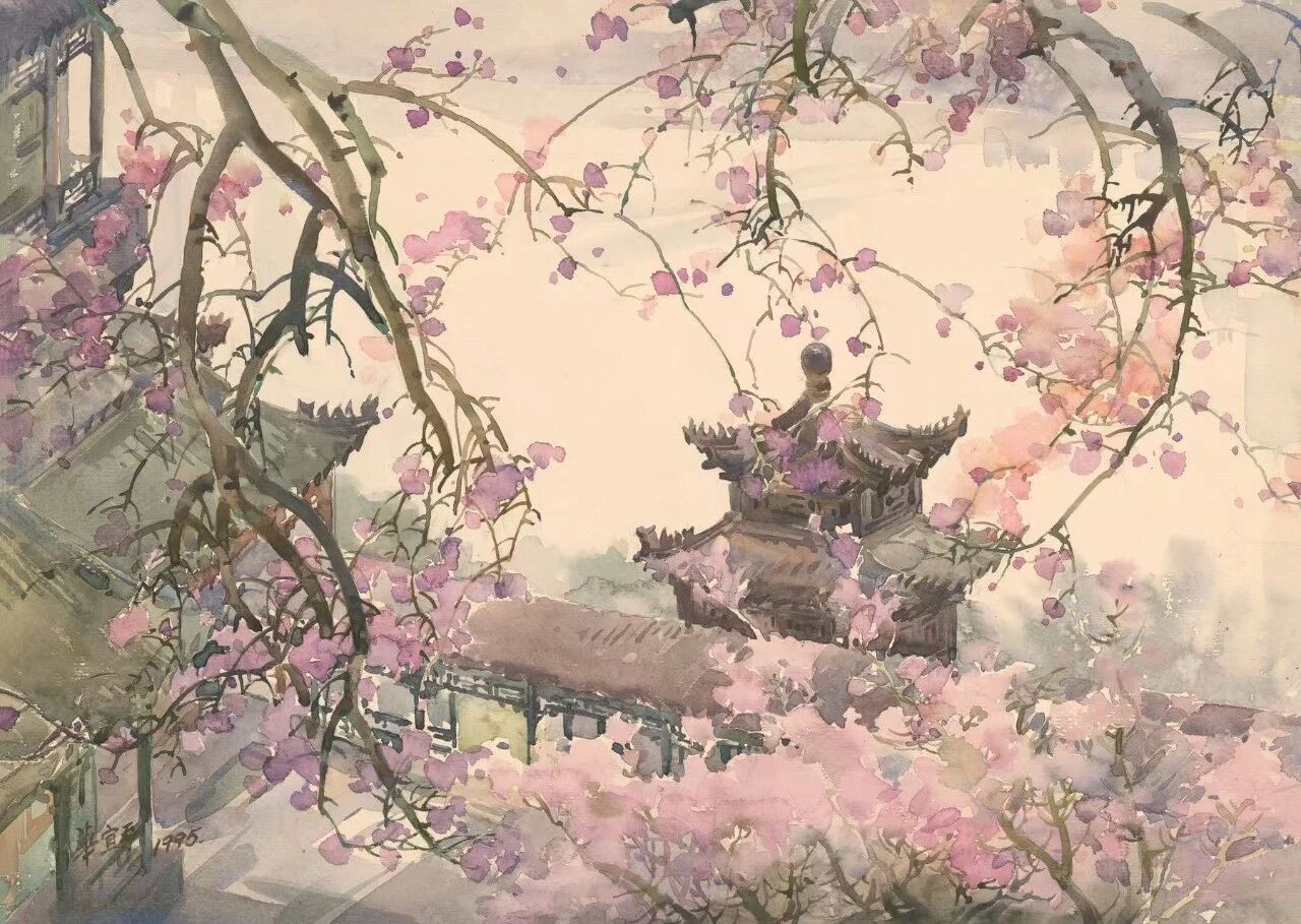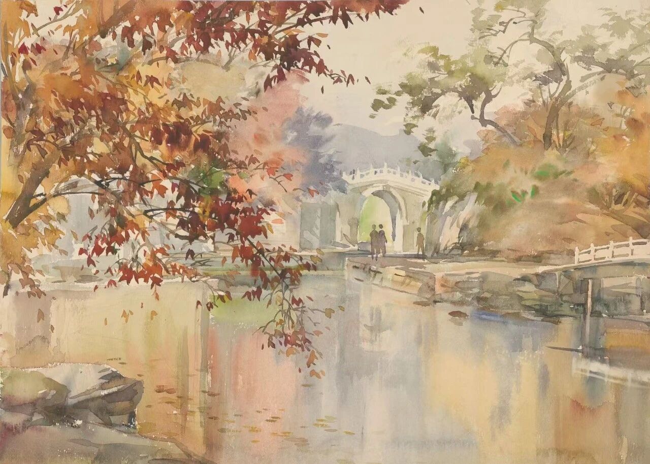 北平国立芸専油画科を卒業する頃には、西洋絵画の色彩論理と中国伝統書画の筆墨功力を兼ね備えていました。1952年、30歳で清華大学建築学科に赴任し、そこから半世紀にわたり教鞭を執りました。授業では「観察は深く、表現は簡潔に」と強調する厳格な教師でありながら、授業後には画板を背負って北京の街を写生して歩き、青春から老境に至るまで筆をもって北京の時の移ろいを記録しました。2005年に逝去する直前まで『建築水彩画技法』の原稿を修正し続けたその執念は、すでに一枚一枚の作品に刻まれています。