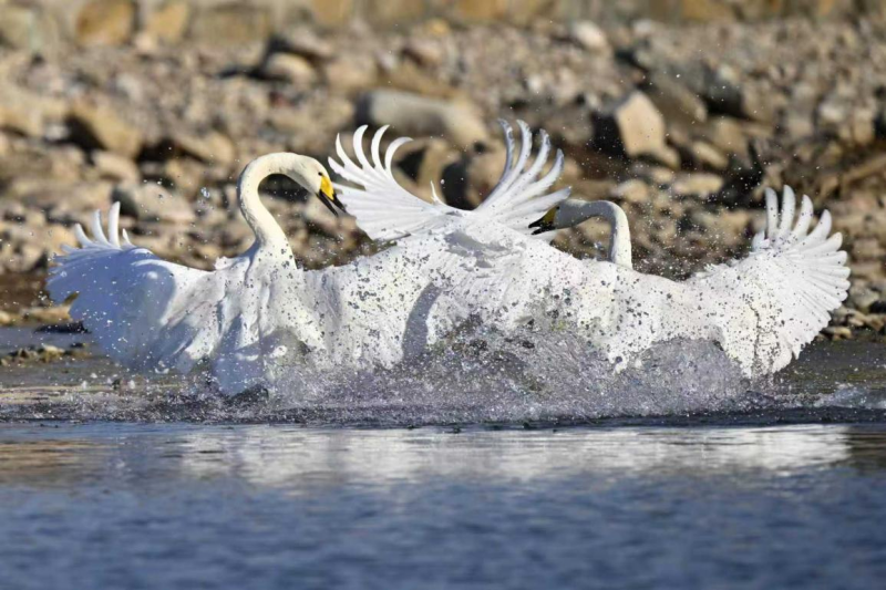 また、密雲区の清水河・太師屯・芦各荘の流域では、ハクチョウの群れが貯水池の干潟などから次々と飛来し、オオハクチョウ、コハクチョウ、コブハクチョウが同じ池で混群となって越冬する光景が観測されている。
