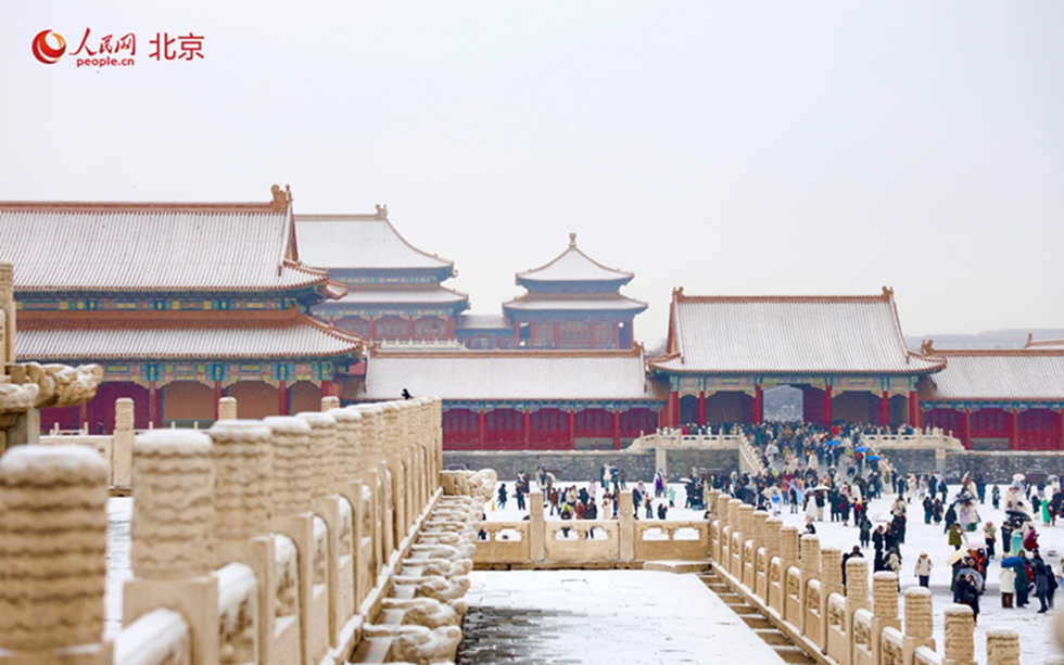 故宮博物院内では、赤い壁と黄色い瓦が白い雪に映えて、いっそう静けさを増していた。北京の中心を南北に貫く中軸線上には、南から北へと建築群が並び、屋根や軒先に積もった雪がアクセントとなり、歴史的建造物の構造美をいっそう引き立てていた。降雪の中でも観光客は秩序正しく故宮を鑑賞し、多くの人が立ち止まって故宮の壁と軒先が雪に覆われる様子を撮影し、雪の故宮は北京の冬を代表する文化的景観となっていた。
