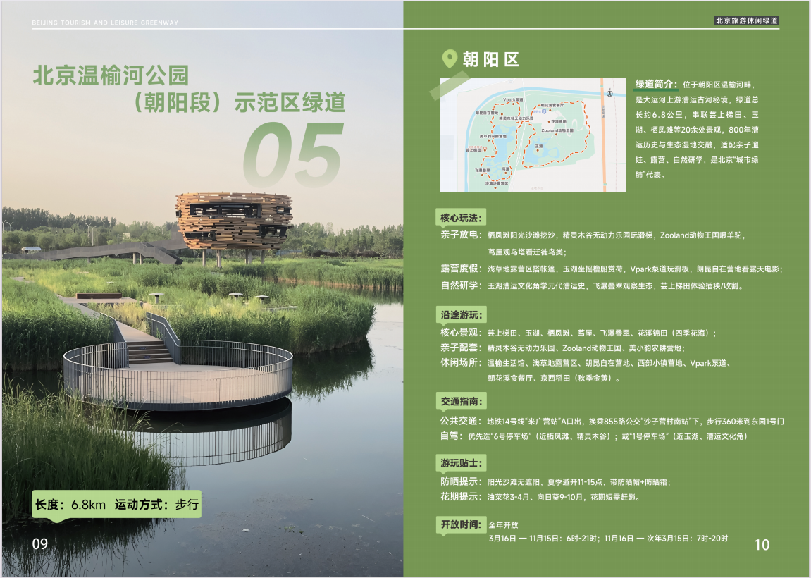 緑道は朝陽区の温榆河沿いに位置し、大運河上流の漕運の古い川の秘境です。緑道の全長は約6.8キロメートルで、芸上(うんじょう)棚田、玉湖(ぎょくこ)、棲鳳灘(せいほうたん)など20か所以上の景観を結んでいます。800年の漕運の歴史と生態湿地が交融し、親子でのお散歩、キャンプ、自然研学に適しており、北京の「都市の緑の肺」を代表する場所です。