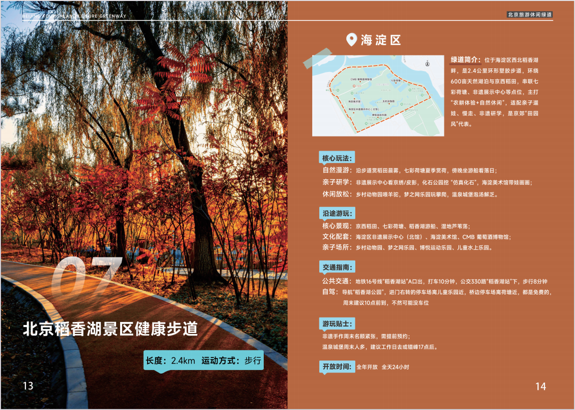 見どころ・施設: 京西稲田、七色秘境、稲香湖遊覧船、湿地の芦原;海淀区無形文化遺産展示センター(北館)、海淀美術館、CMBワイン博物館。