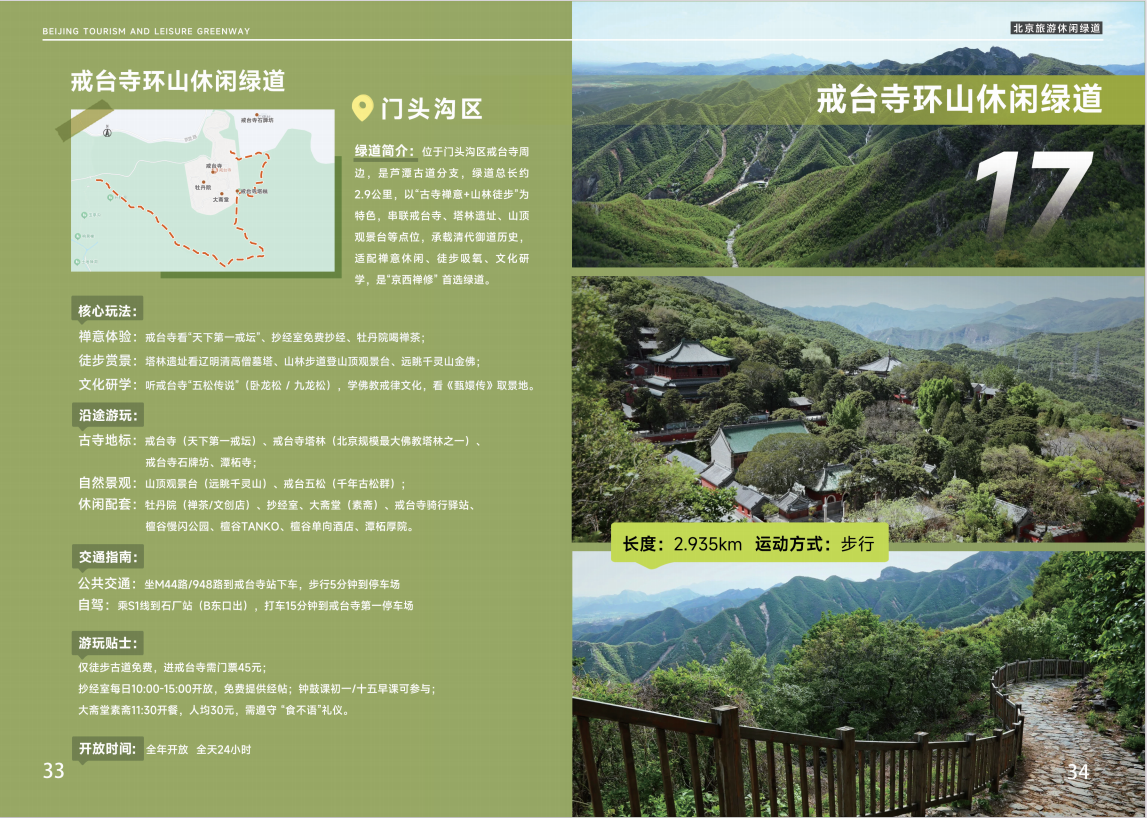 門頭溝区の戒台寺周辺に位置し、芦潭古道の支線です。緑道の全長は約2.9キロメートルで、「古寺の禅の趣き+山林ハイキング」を特色とし、戒台寺、塔林遺跡、山頂展望台などを結び、清代の御道の歴史を伝えています。禅の趣きを味わうレジャー、ハイキングで酸素を吸う、文化研学に適しており、「京西の禅修」に最適な緑道です。