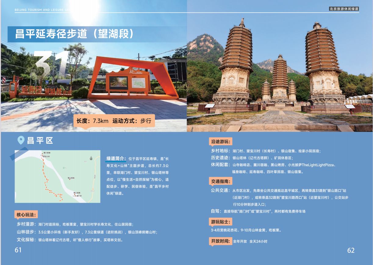 昌平区延寿鎮に位置し、「長寿文化+山林」をテーマにした歩道です。全長約7.3キロメートルで、湖門村、望宝川村、銀山塔林などのスポットを結び、「スローライフ+自然探検」を中核としています。ハイキング、学習、民宿体験に適した、「昌平の田園レジャー」を代表する緑道です。