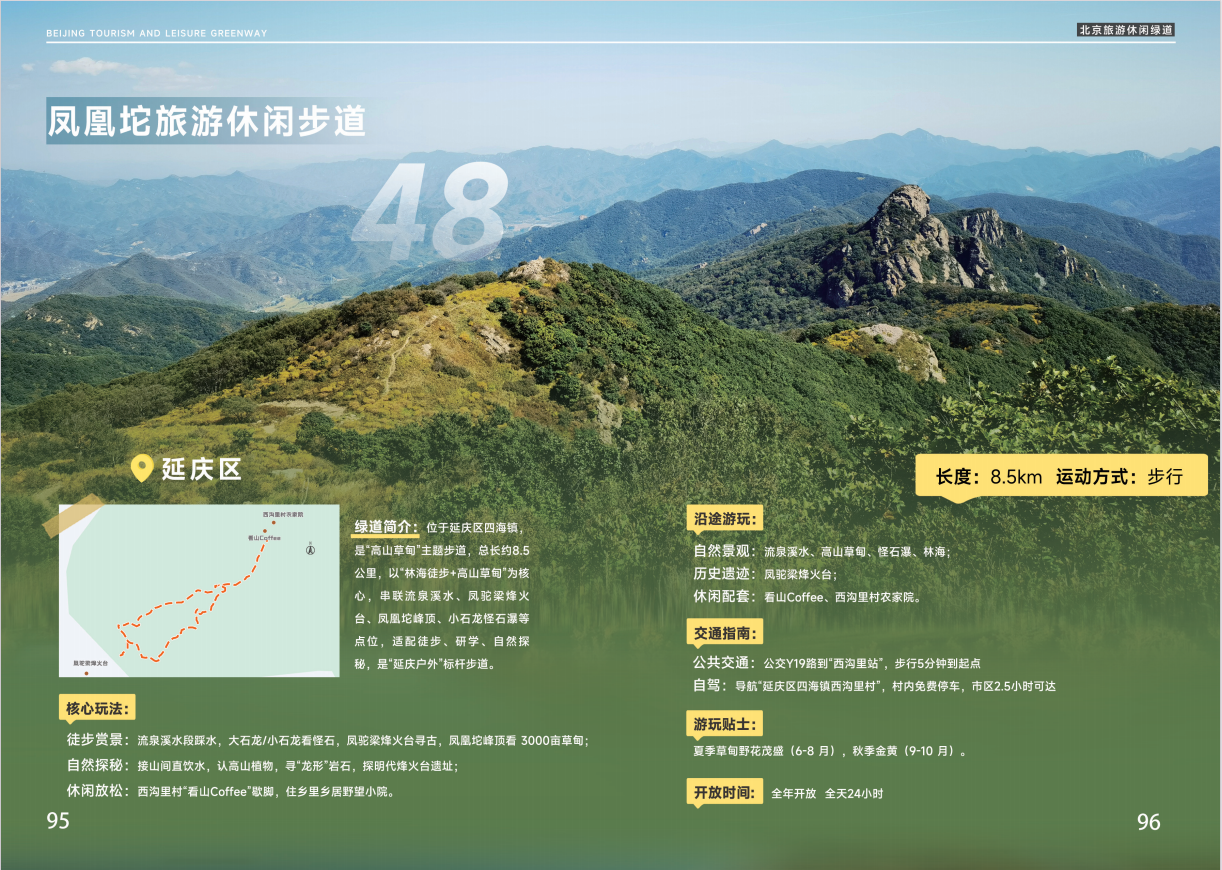 延慶区四海鎮に位置し、「高山草原」をテーマにした歩道です。全長約8.5キロメートルで、「樹海ハイキング+高山草原」を中核とし、流れる泉と渓流、鳳駝梁の烽火台、小石龍の奇岩潭などのスポットを結んでいます。ハイキング、学習、自然探検に適した、延慶のアウトドアのモデルとなる歩道です。