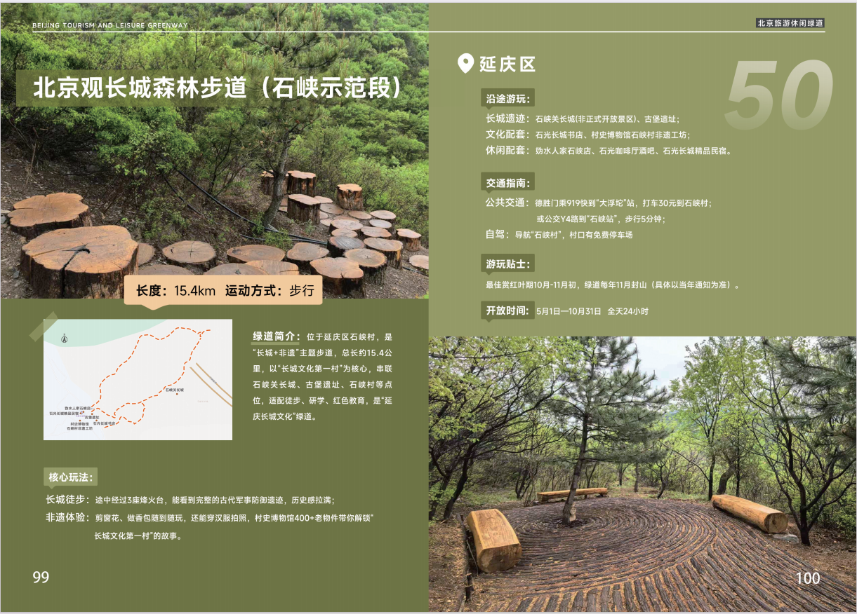 延慶区石峡村に位置し、「長城+無形文化財」をテーマにした歩道です。全長約15.4キロメートルで、「長城文化第一村」を中核とし、石峡関長城、古堡遺跡、石峡村などのスポットを結んでいます。ハイキング、学習に適した、延慶の長城文化を伝える緑道です。