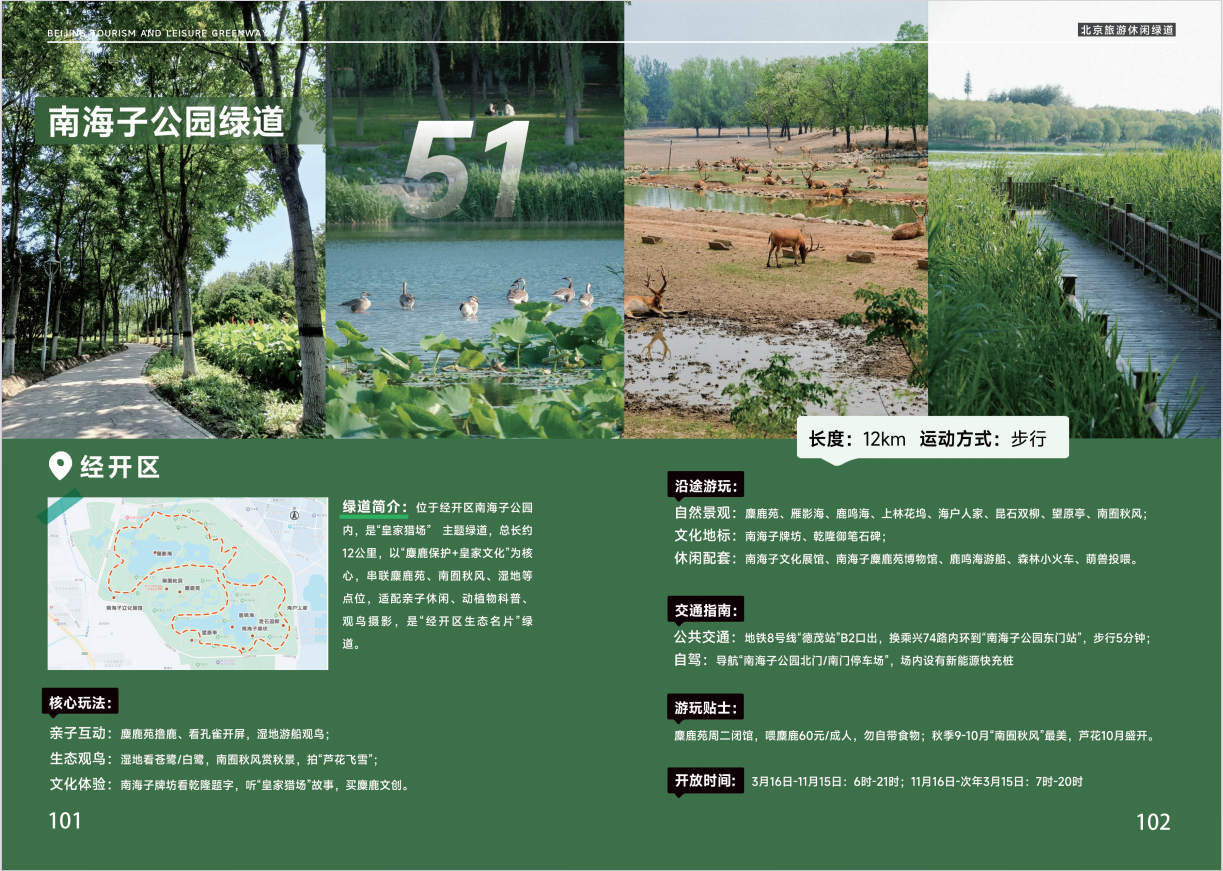 経済技術開発区(経開区)の南海子公園内に位置し、「皇室狩猟場」をテーマにした緑道です。全長約12キロメートルで、「シフゾウ保護+皇室文化」を中核とし、シフゾウ苑、南囿秋風、湿地などのスポットを結んでいます。家族でのレジャー、動植物の科学普及、野鳥観察・写真撮影に適した、経開区のエコロジーを代表する緑道です。