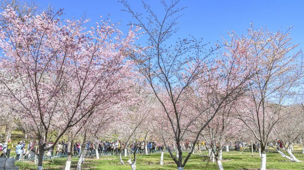 薄紅色の花枝が中央電視塔を「取り囲み」