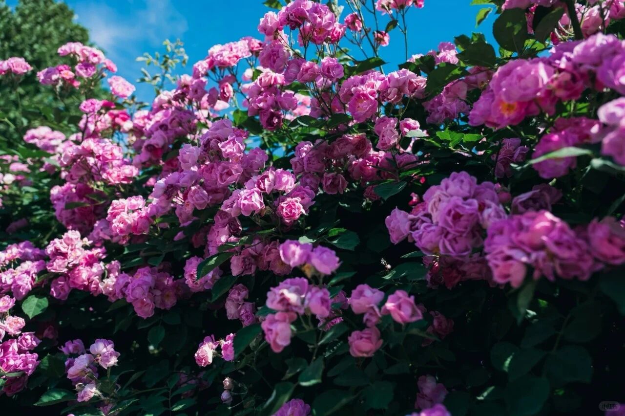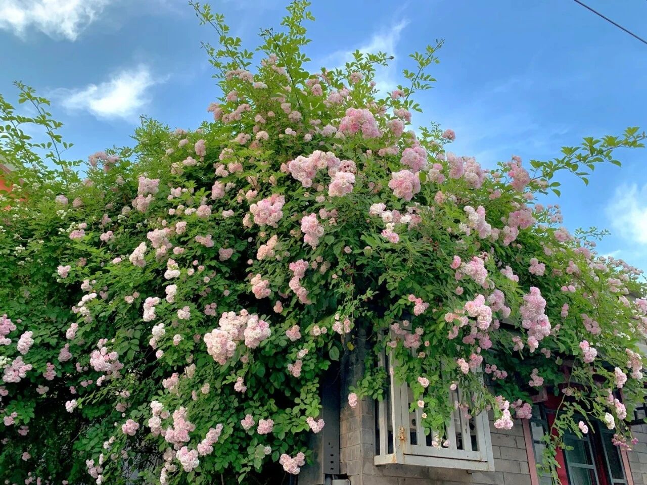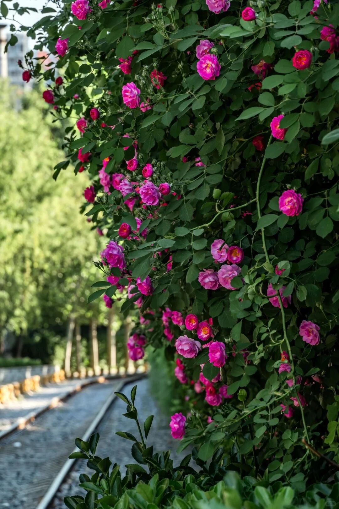 曲がり角で一面のバラの花壁に出会う