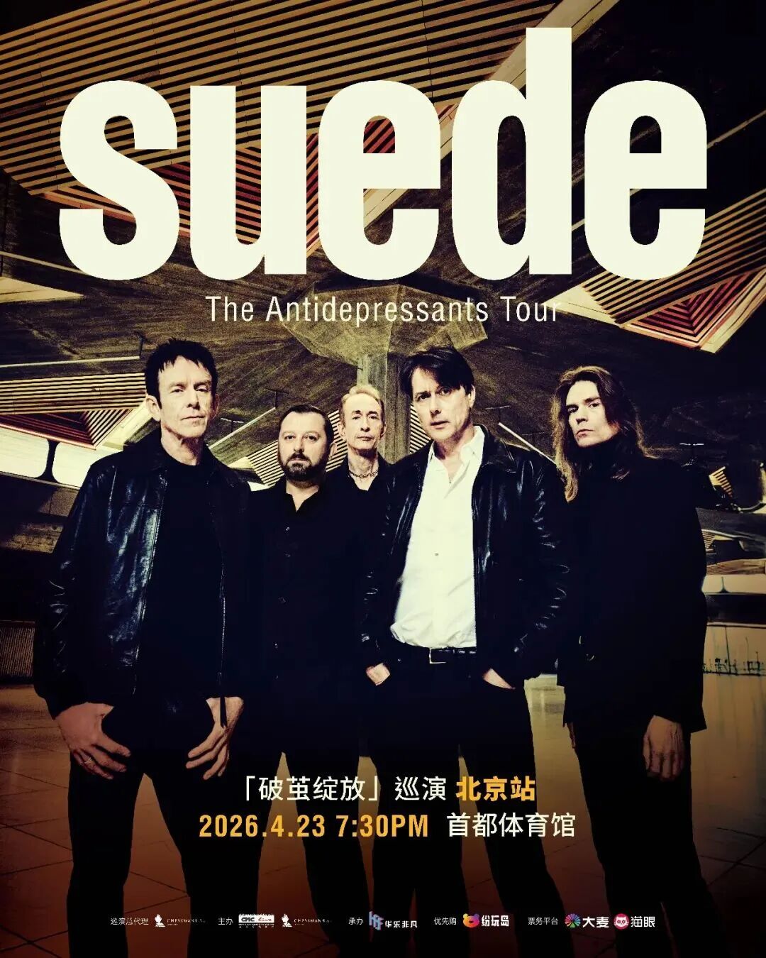 ブリットポップの波が来日!英ロックの四天王の一角を担うSuede(スウェード/中国語名「山羊皮」)が、2026年に最新ツアー「The Antidepressants Tour」をスタートさせます。ロックンロールを通じて、あなたと私の魂に呼びかけ、熱狂のライブ会場で脱皮し、本当の自分を開花させましょう。